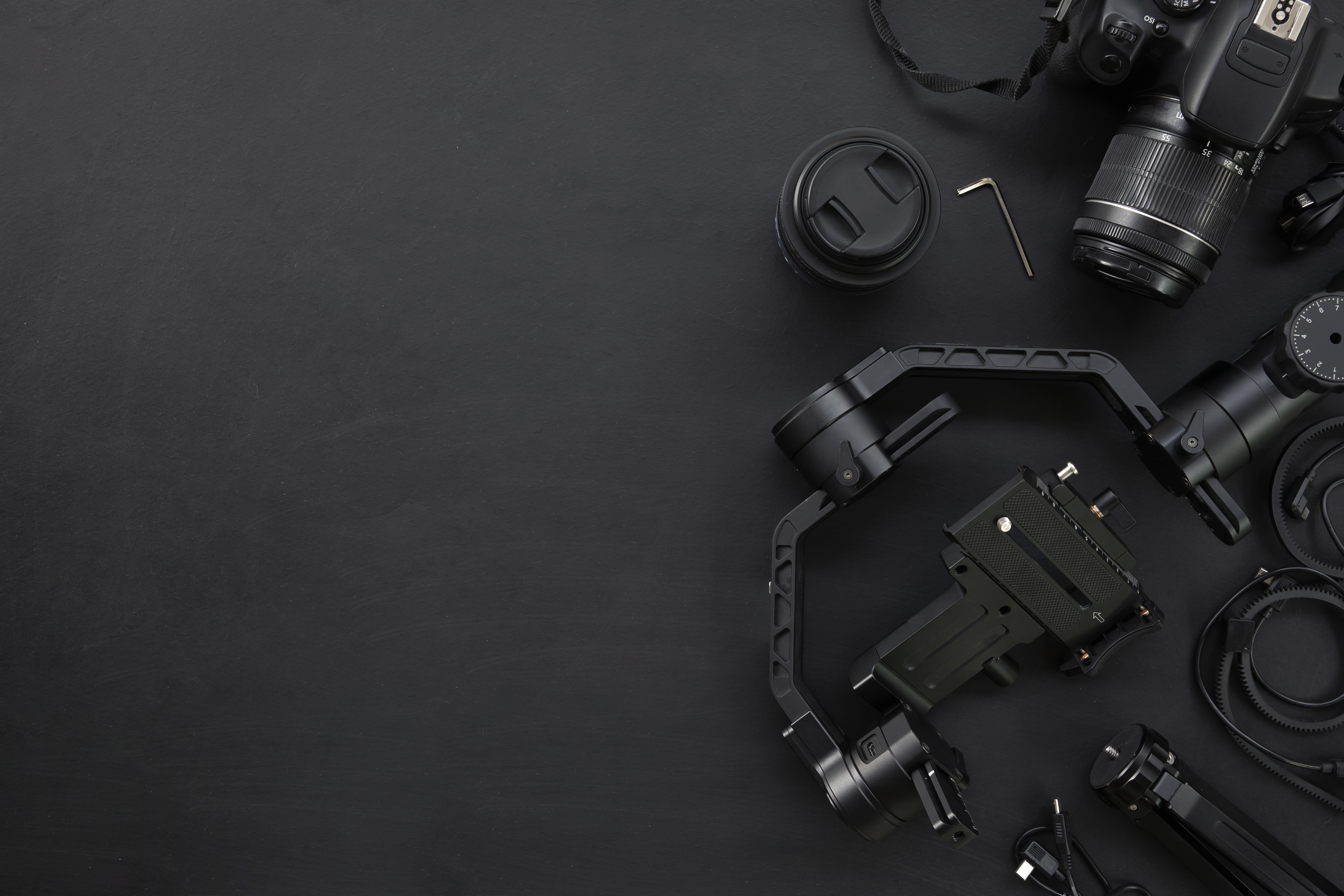 top view of work space photographer with digital camera and accessory on black background with copy space. flat lay